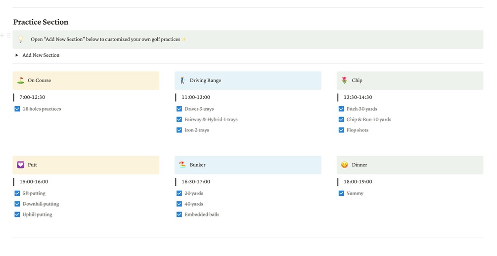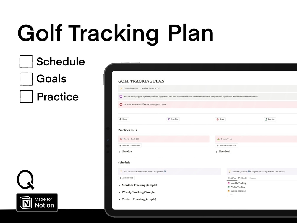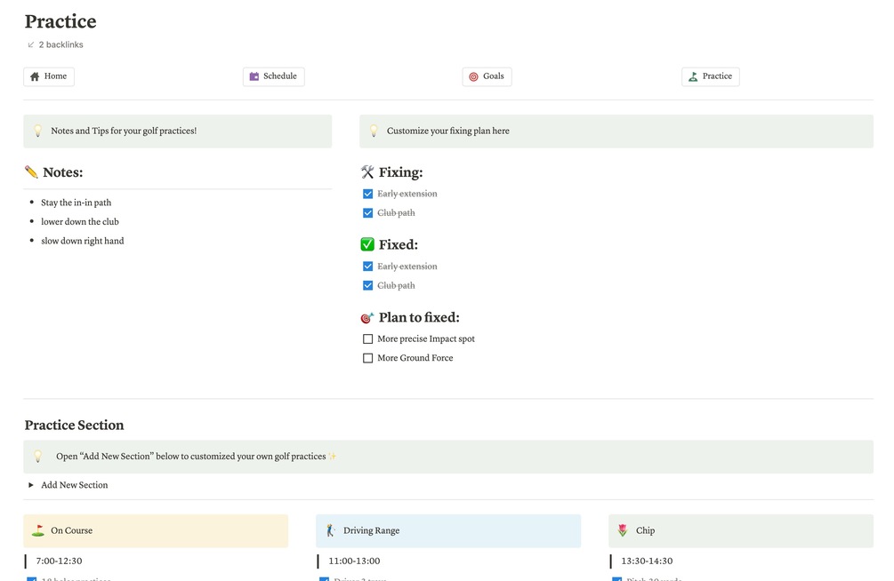 - Practice: Use "Notes and Tips" section to take notes about your golf swing or plan. Identify and write require improvement and customize your own fixing plan. Plan your own practice sessions down to hour.