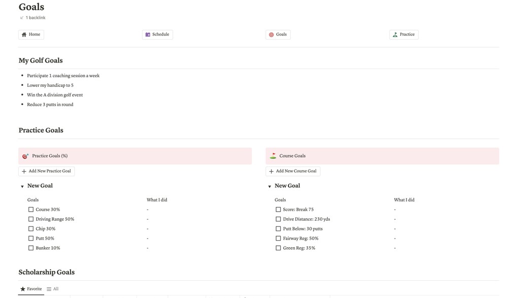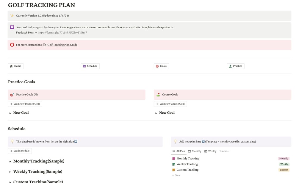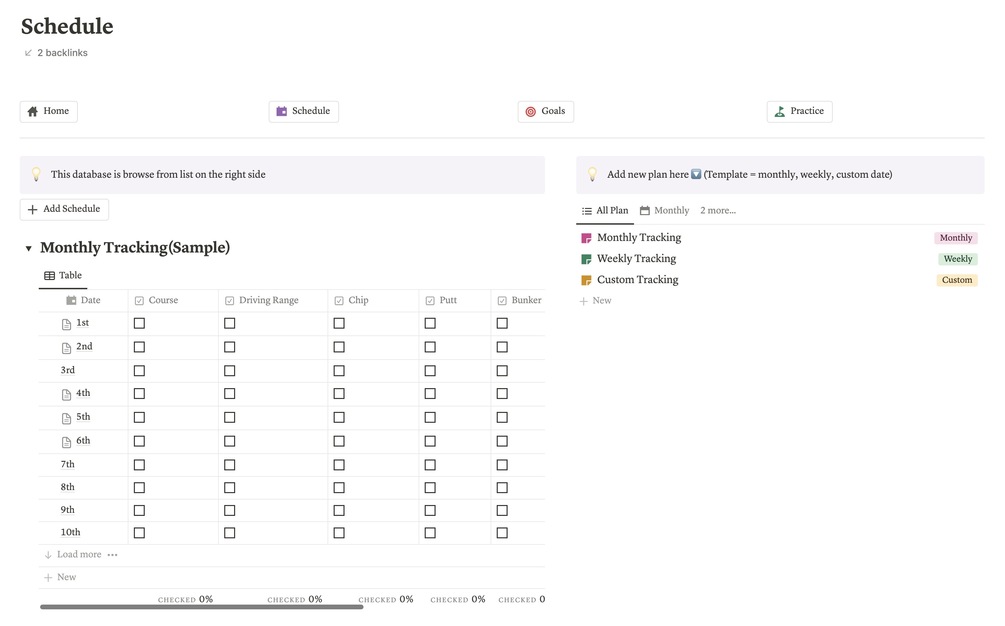 - Schedule: Easily organize your golf practice routine on a monthly, weekly or customize your own plan with checkboxes to track your practice: course, driving range, chip, putt, bunker.