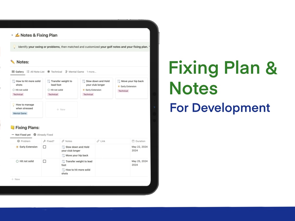 - Practice Management: Help you organized your golf practice with practice checkboxes, notes and fixing plan.