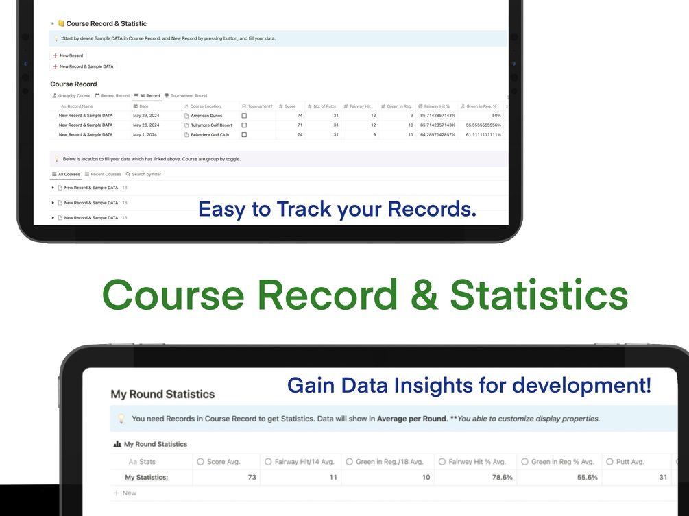 - Track key statistics such as avg. score, fairway hit, green in regulation, putts, and more (customize as needed).